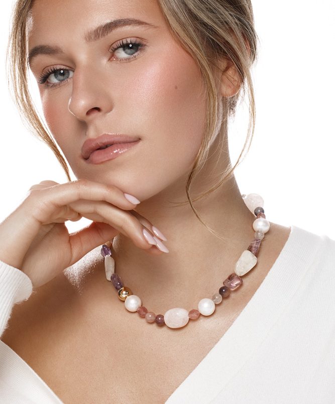 Rozenkwarts staat symbool voor liefde, zachtheid en harmonie, terwijl strawberry kwarts een warme, positieve energie draagt en wordt geassocieerd met vreugde en emotionele balans. Maansteen versterkt intuïtie en innerlijke rust en staat voor nieuwe beginpunten. Amethist brengt kalmte en helderheid en ondersteunt spirituele groei. Rutiel kwarts wordt gezien als een krachtige versterker van intenties en energie. De zoetwaterparels voegen een elegante glans toe en symboliseren zuiverheid, wijsheid en verfijning.