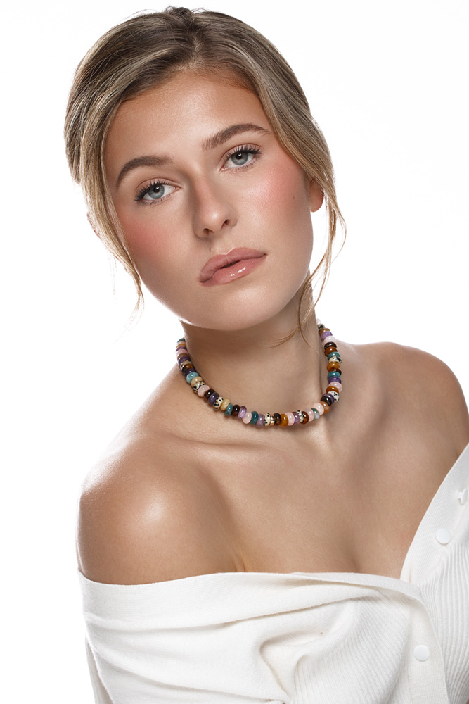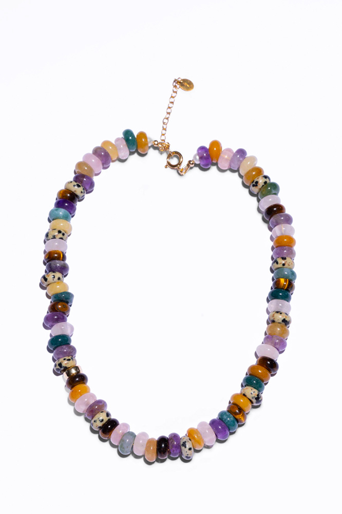 Dit opvallende en betekenisvolle sieraad is vervaardigd van hoogwaardig gold filled en verrijkt met dalmatierjaspis, rozenkwarts, amethist, jade, mosagaat en tijgeroog