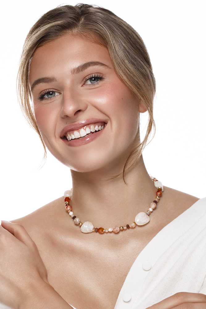 De maansteen staat symbool voor intuïtie, vrouwelijke energie en nieuwe beginpunten, terwijl Chinese maansteen bekend staat om haar kalmerende en beschermende werking. Agaat brengt balans, stabiliteit en innerlijke rust. Zonnesteen voegt een warme, positieve energie toe en staat voor levensvreugde en zelfvertrouwen. De zoetwaterparels geven het sieraad een zachte, luxe glans en worden geassocieerd met zuiverheid, wijsheid en elegantie.