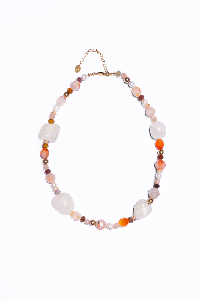 Dit luxe sieraad is met zorg vervaardigd van gold filled en verrijkt met Chinese maansteen, maansteen, agaat, zonnesteen en zoetwaterparels.